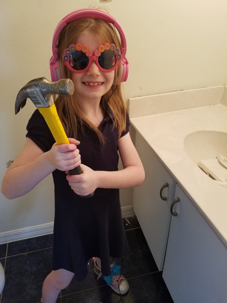 Rebecca dropped the hammer on the top of the old countertop, but the thing barely cracked.