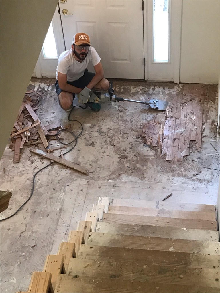 That bathroom became my obsession in the weeks that followed. I pried baseboards and ceramic towel racks off the wall, then chiseled up old tile. Soon, I was down to just a concrete floor with a toilet hole that I plugged with an old pink rag. I spent even more time researching the tile work than I did the toilet, learning so many exciting new words along the way that I couldn’t wait to bust out in the future to impress my know-nothing friends and family. Subfloor! Wet saw! Wax ring!